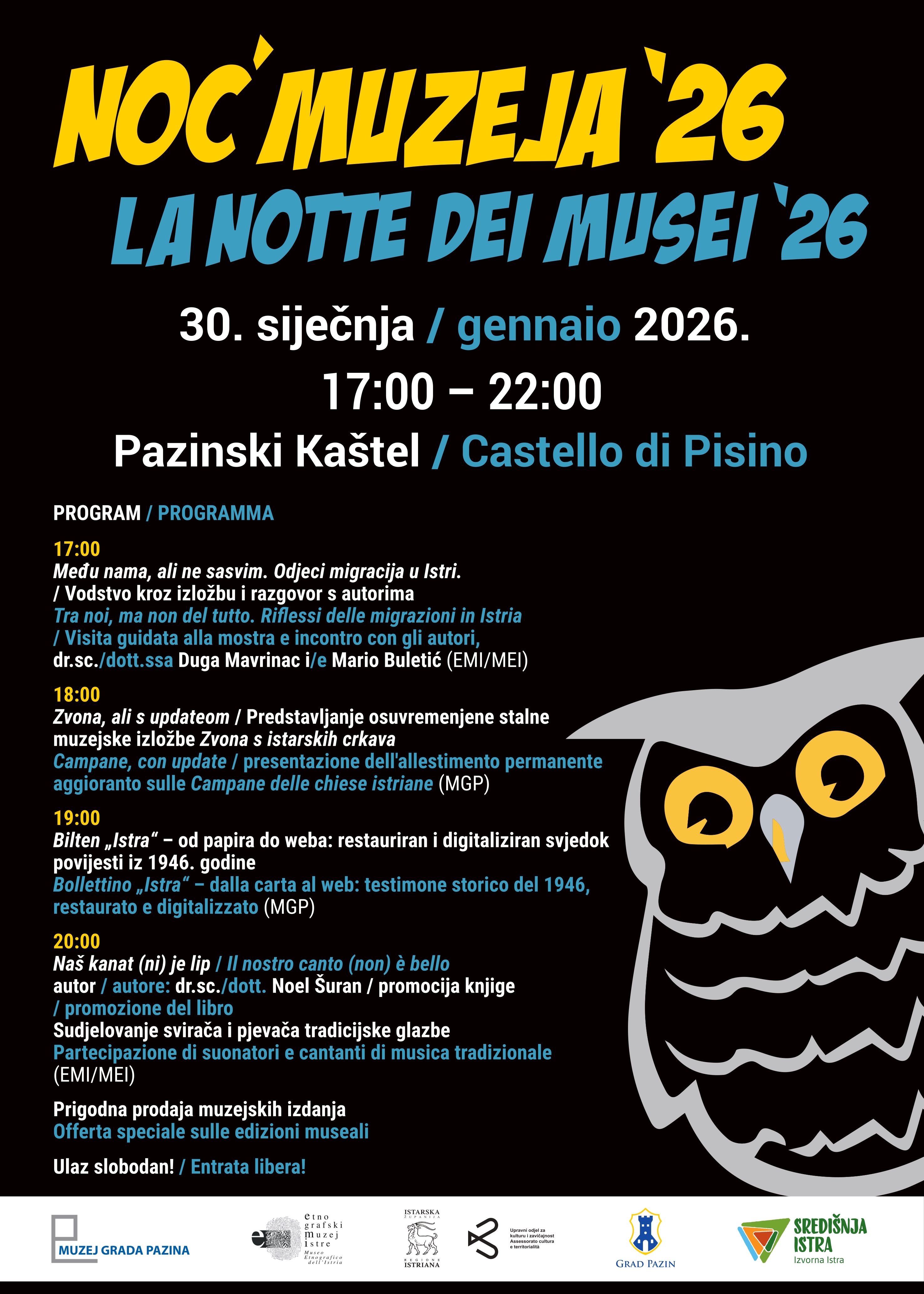 Program počinje u 17 sati, a završava oko 22 sata. Ulaz je slobodan, a tijekom Noći muzeja organizirana je prigodna prodaja muzejskih izdanja Muzeja grada Pazina i Etnografskog muzeja Istre/Museo etnografico dell'Istria.