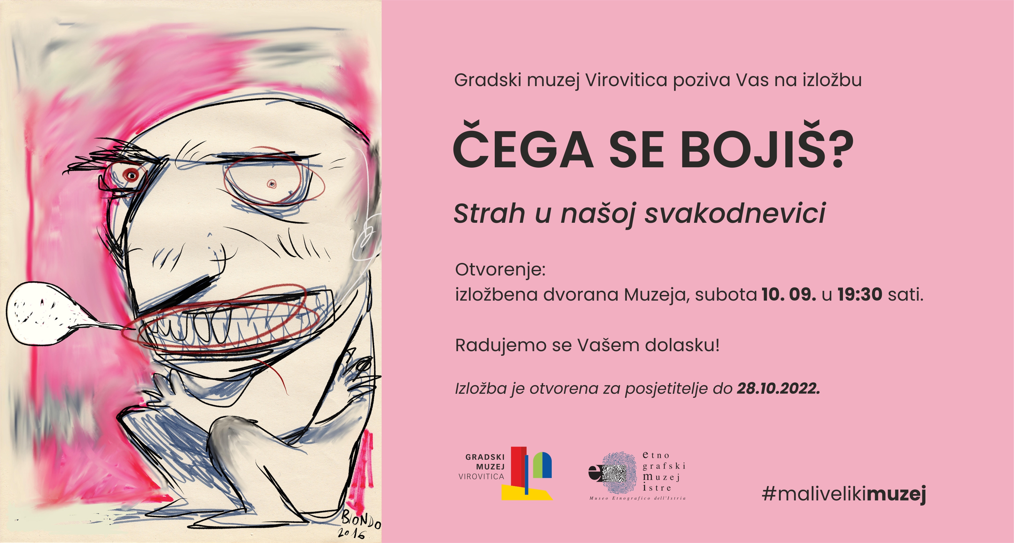 Nakon dvije godine, izložba Etnografskog muzeja Istre Čega se bojiš? Strah u našoj svakodnevici oživjet će u prilagođenom izdanju u prostorima Gradskog muzeja Virovitica. Otvorenje izložbe je u subotu 10.9.2022. s početkom u 19.30 sati. Izložbu će biti moguće posjetiti do 28.10.2022.